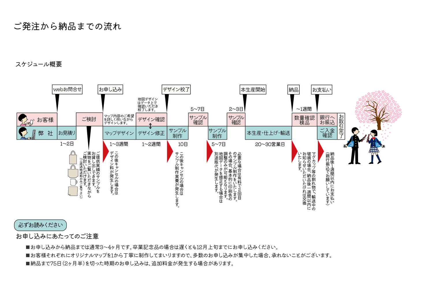 学校を中心に駅や公園、図書館など、卒業生の思い出が詰まった地図柄グッズは巣立ちの記念品として最適です。数多くの製作実績により、PTAご担当者さまの負担も少なくスムーズな制作が可能です。